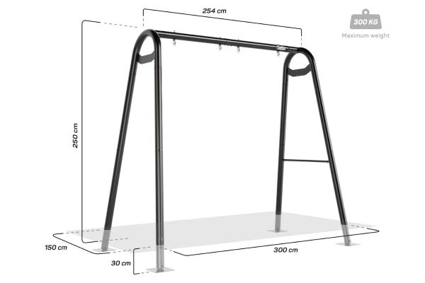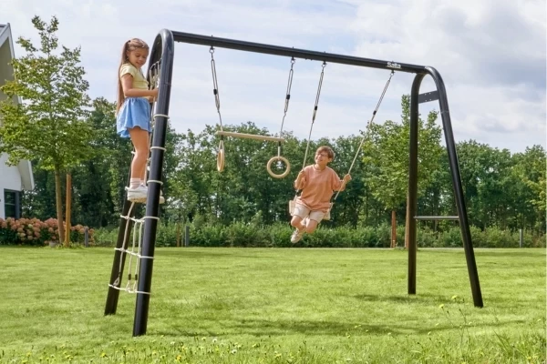 Maak van je tuin dé plek voor beweging, spel en avontuur met de Salta PlayFit Schommel (300x150x250 cm). Dit veelzijdige alles-in-één speel- en sportframe pas je volledig aan naar de wensen van jouw gezin! Het robuuste frame is van gegalvaniseerd staal met een zwarte poedercoating. Roestvrijstalen bevestigingen en duurzame materialen maken het frame weerbestendig en onderhoudsarm. Het ophangsysteem maakt het wisselen van accessoires moeiteloos. Deze set bevat een duikelrek, schommel, trapeze met ringen en een klimnet. Het Polyhemp-touw van alle accessoires is zacht voor de handen, vuilafstotend en weerbestendig. Om het speeltoestel te installeren moeten de zelfstabiliserende poten stevig verankerd worden in snelbeton (niet inbegrepen).